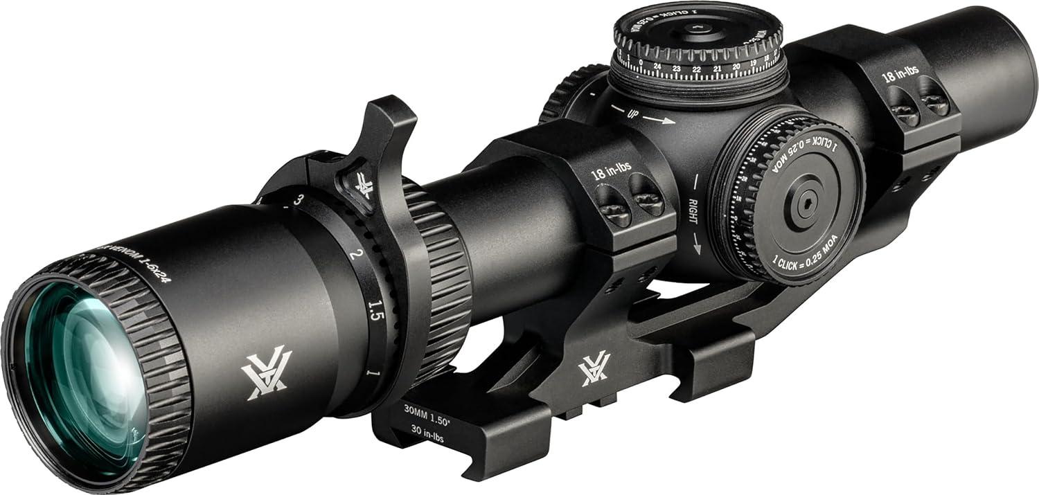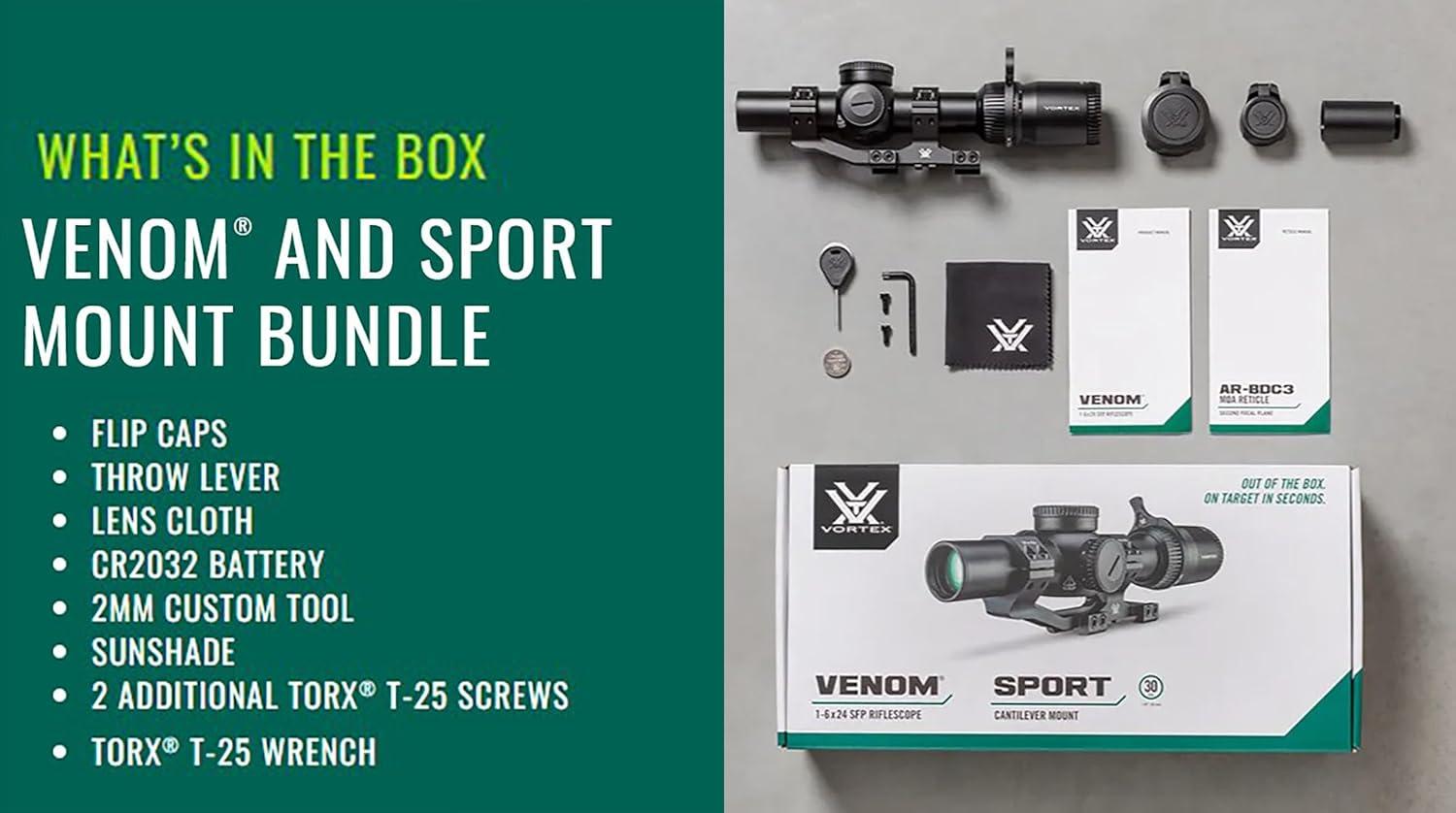 The Venom 1-6×24 Second Focal Plane riflescope combines speed, performance, and value to meet the demands of entry-level competition shooting or hunting. The single piece, shockproof, 30mm aircraft aluminum tube is built tough.